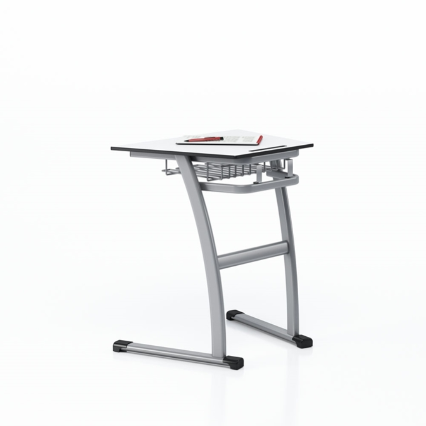 Trapezoidal student desk, combining high quality compact laminate wood, resilient metal with a DKP SD 44 profile of 25*50*1.5 mm, securely fastened plastic end caps, and electrostatic anti-rust painting. Designed for durability and style, this deskprovides an ideal environment for concentration and productivity.