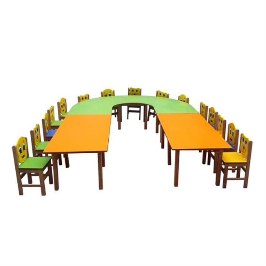 U-shaped melamine assemblable table, perfect for kindergarten and preschool classrooms. This spacious table can accommodate up to 15 children and is divided into three convenient sections for easy assembly and disassembly. Vibrantly colored to complement any classroom decor, it provides ample space for collaborative learning and activities.